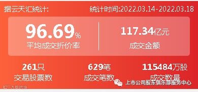 2022年3月14日至2022年3月18日,大宗交易成交金额117.34亿元,交易股票数261只,成交笔数629笔,平均成交折价率为96.69%,成交数量115484万股。