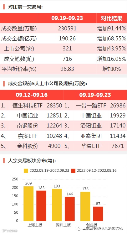 2022年9月19日至2022年9月23日,大宗交易成交金额190.26亿元,交易股票数321只,成交笔数716笔,平均成交折价率为96.83%,成交数量230591万股。