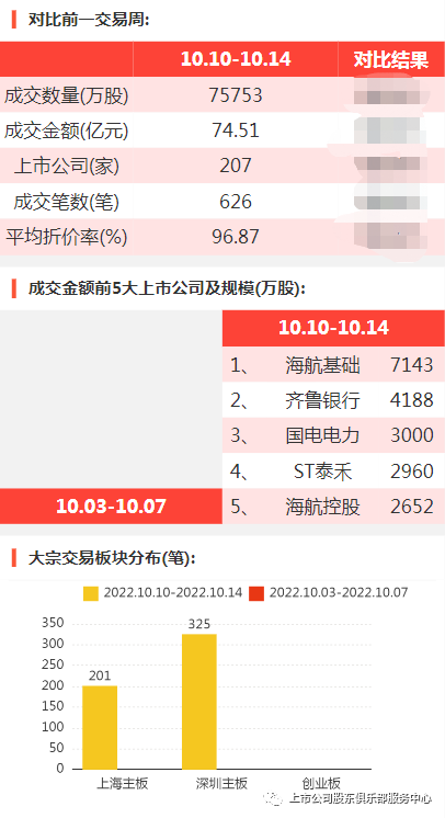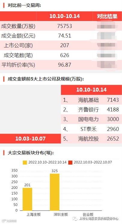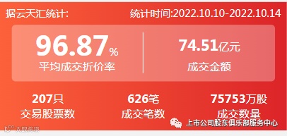 2022年10月10日至2022年9月30日,大宗交易成交金额137.65亿元,交易股票数207只,成交笔数626笔,平均成交折价率为96.87%,成交数量75753万股。