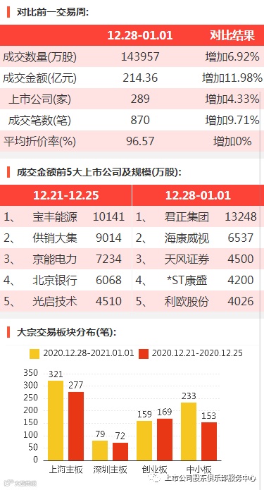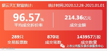2020年12月28日至2021年1月1日,大宗交易成交金额214.36亿元,交易股票数289只,成交笔数870笔,平均成交折价率为96.57%,成交数量143957万股。