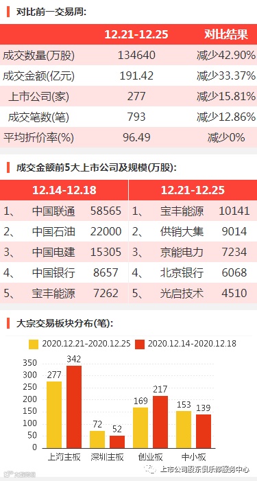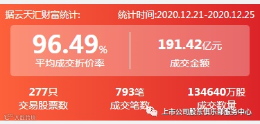 2020年12月21日至12月25日,大宗交易成交金额191.42亿元,交易股票数277只,成交笔数793笔,平均成交折价率为96.49%,成交数量134640万股。