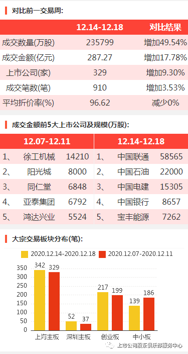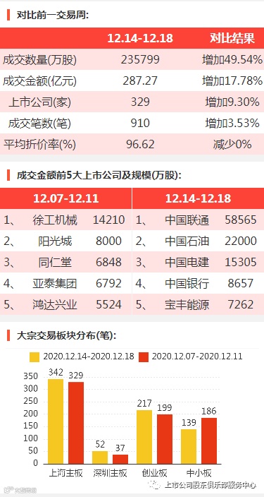 2020年12月14日至12月18日,大宗交易成交金额287.27亿元,交易股票数329只,成交笔数910笔,平均成交折价率为96.62%,成交数量235799万股。