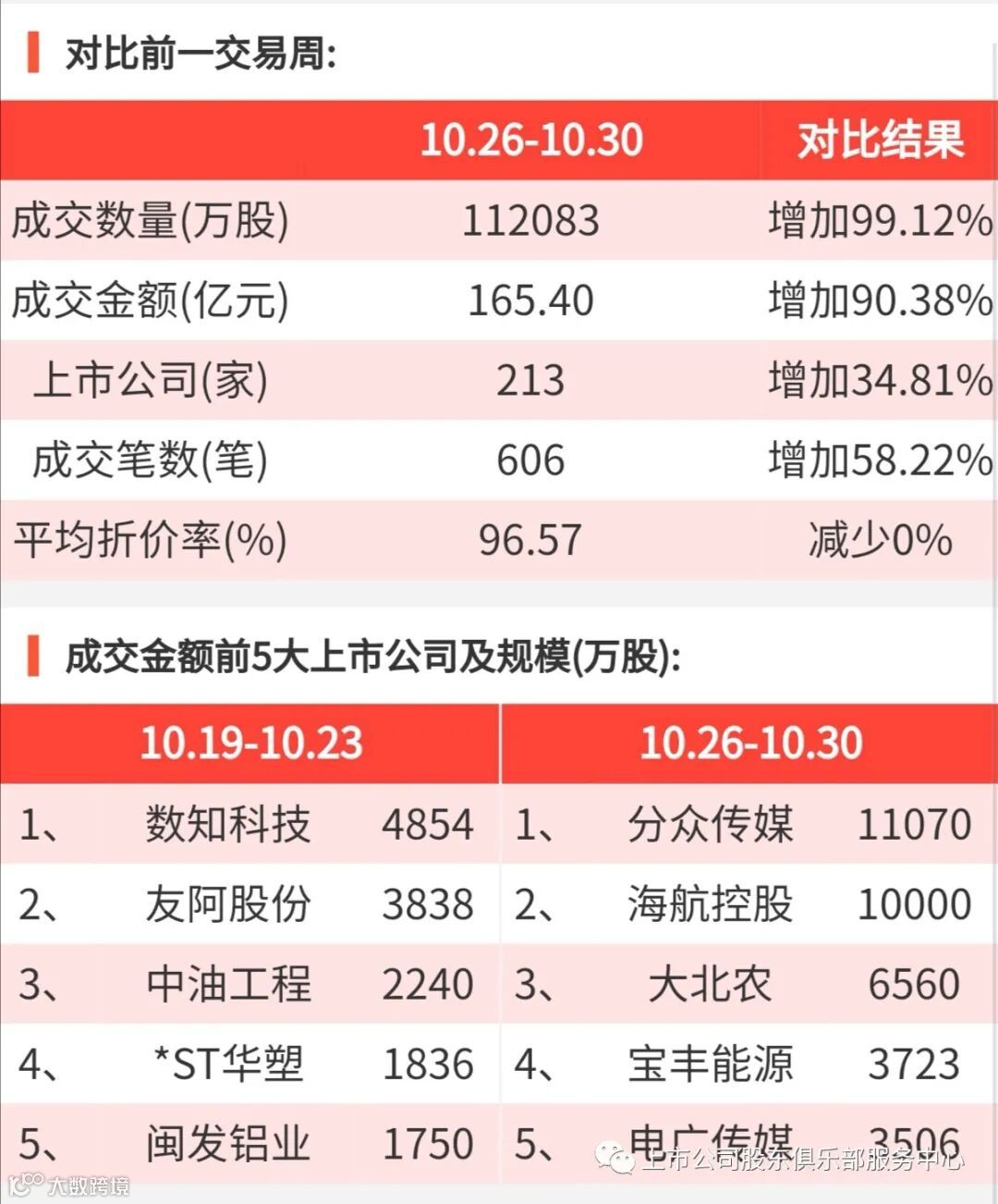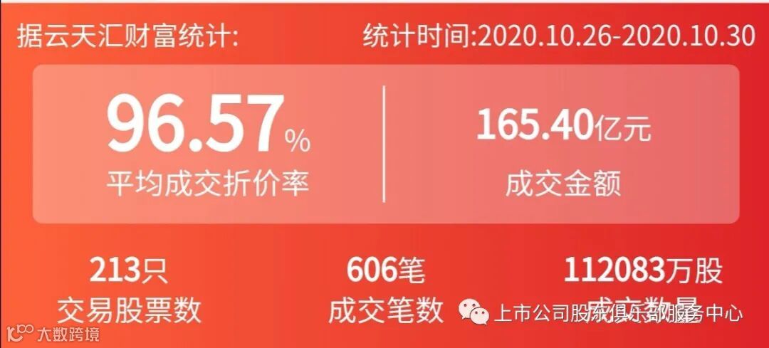 2020年10月26日至10月30日,大宗交易成交金额165.4亿元,交易股票数213只,成交笔数606笔,平均成交折价率为96.75%,成交数量112083万股。