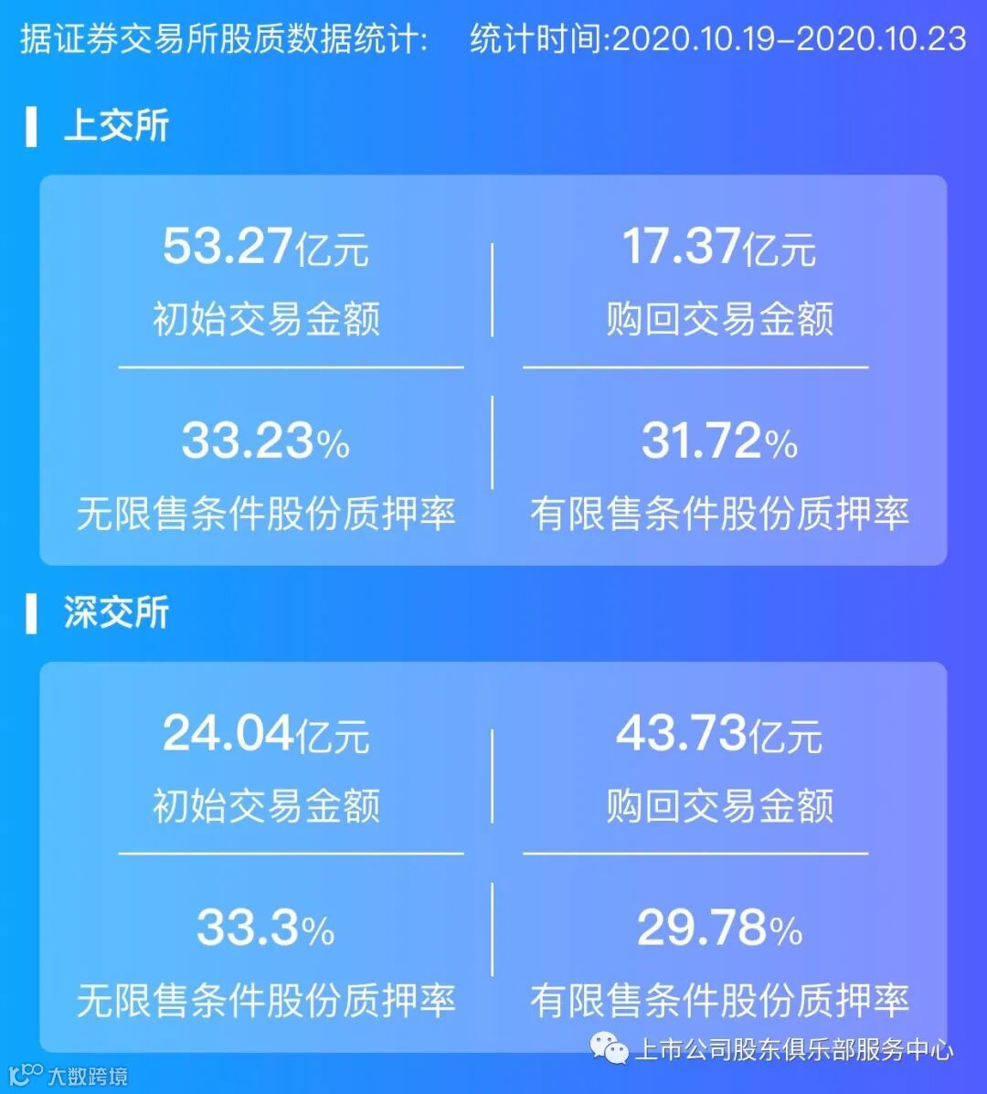 2020年10月19日至10月23日,上交所初始交易金额53.27亿元,购回交易金额17.37亿元;深交所初始交易金额24.04亿元,购回交易金额43.73亿元。
