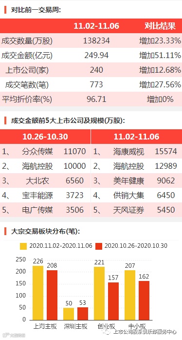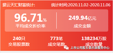 2020年11月2日至11月6日,大宗交易成交金额249.94亿元,交易股票数240只,成交笔数773笔,平均成交折价率为96.71%,成交数量138234万股。