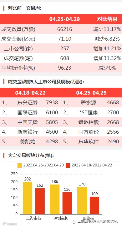 2022年4月25日至2022年4月29日,大宗交易成交金额71.10亿元,交易股票数257只,成交笔数608笔,平均成交折价率为96.23%,成交数量66216万股。