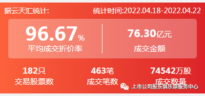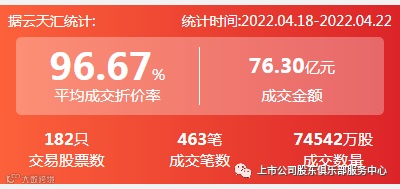 2022年4月18日至2022年4月22日,大宗交易成交金额76.3亿元,交易股票数182只,成交笔数463笔,平均成交折价率为96.67%,成交数量74542万股。