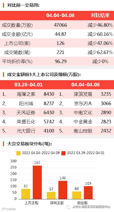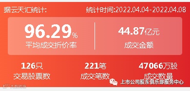 2022年4月4日至2022年4月8日,大宗交易成交金额44.87亿元,交易股票数126只,成交笔数221笔,平均成交折价率为96.29%,成交数量47066万股。
