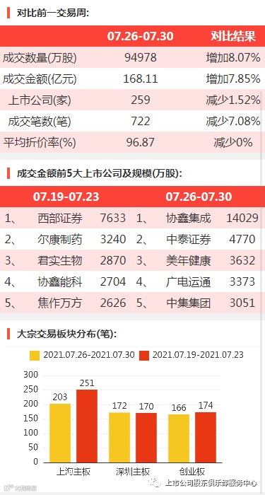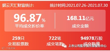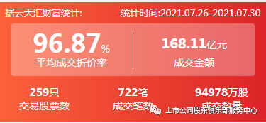 2021年7月26日至2021年7月30日,大宗交易成交金额168.11亿元,交易股票数259只,成交笔数722笔,平均成交折价率为96.87%,成交数量94978万股。