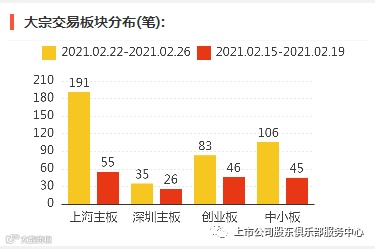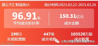 2021年2月22日至2021年2月26日,大宗交易成交金额150.31亿元,交易股票数199只,成交笔数447笔,平均成交折价率为96.91%,成交数量103520万股。