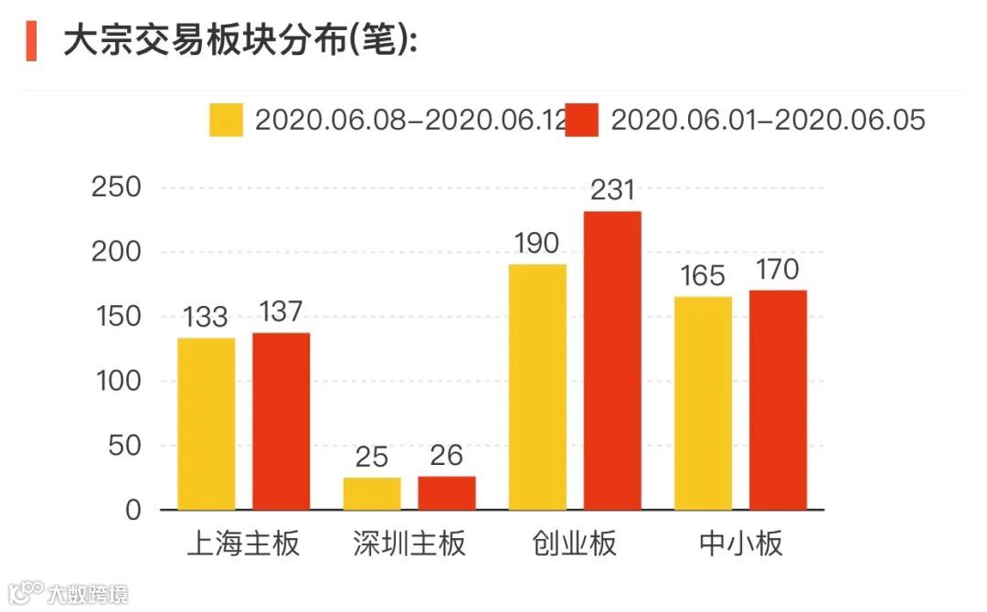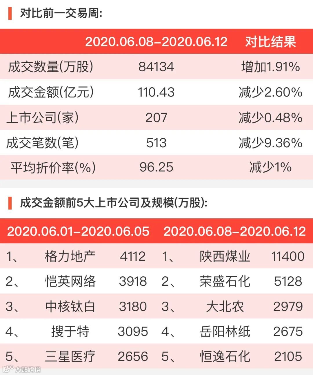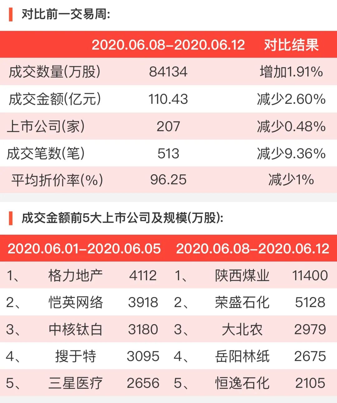 2020年6月8日至6月12日,大宗交易成交金额110.43亿元,交易股票数207只,成交笔数513笔,平均成交折价率为96.25%,成交数量84134万股。