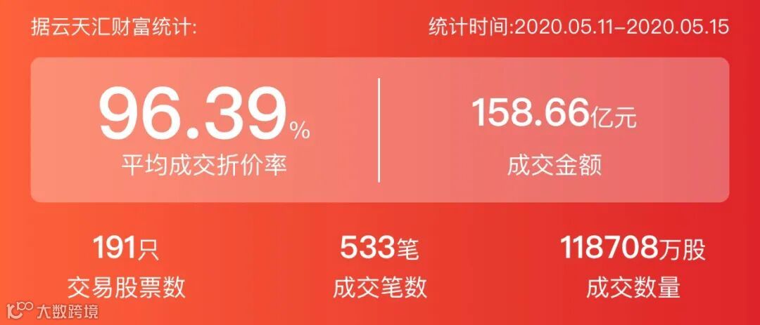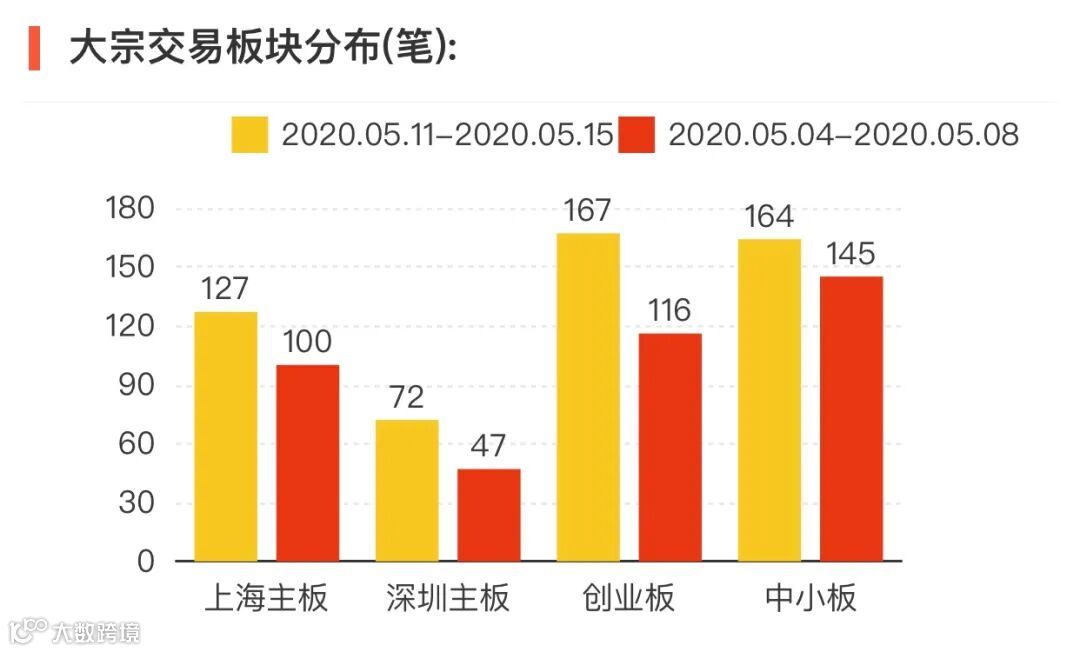 2020年5月11日至5月15日,大宗交易成交金额158.66亿元,交易股票数191只,成交笔数533笔,平均成交折价率为96.39%,成交数量118708万股。