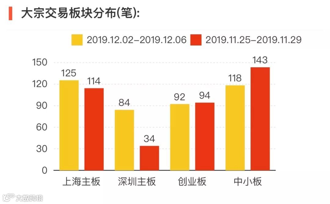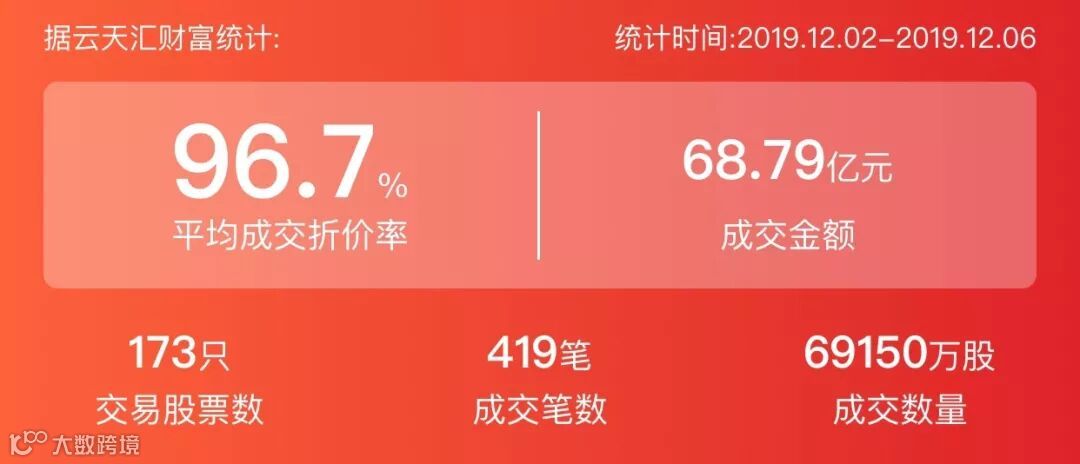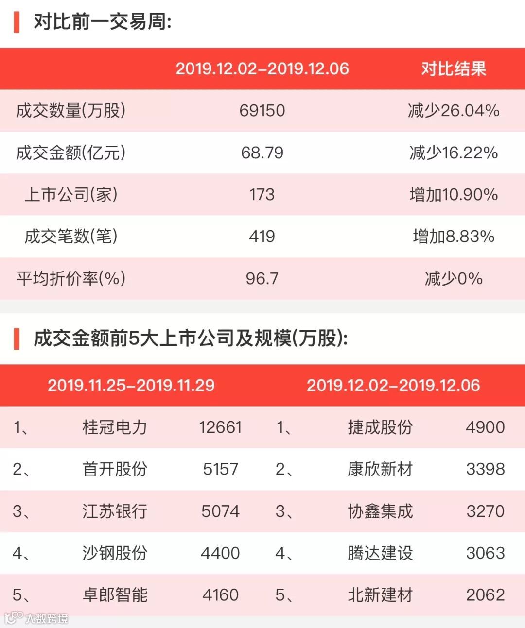 2019年12月2日至12月6日,大宗交易成交金额68.79亿元,交易股票数173只,成交笔数419笔,平均成交折价率为96.7%,成交数量69150万股。
