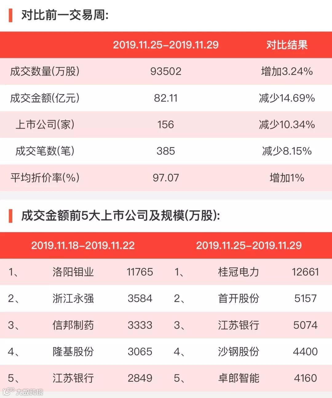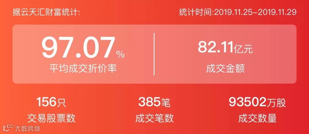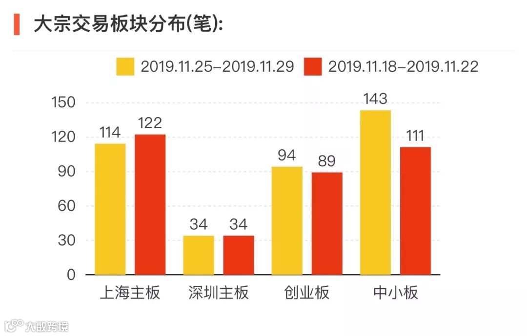 2019年11月25日至11月29日,大宗交易成交金额82.11亿元,交易股票数156只,成交笔数385笔,平均成交折价率为97.07%,成交数量93502万股。