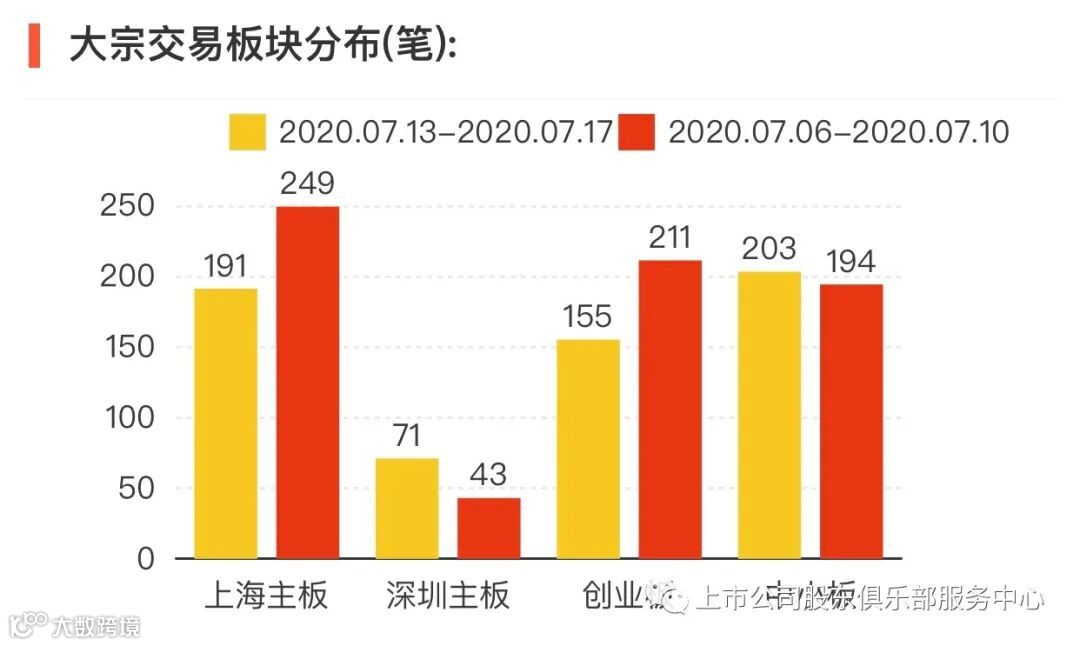 2020年7月13日至7月17日,大宗交易成交金额173.04亿元,交易股票数264只,成交笔数623笔,平均成交折价率为96.68%,成交数量128024万股。