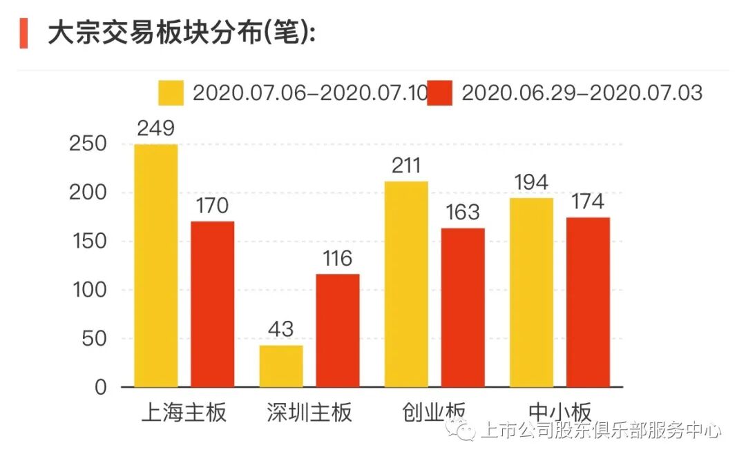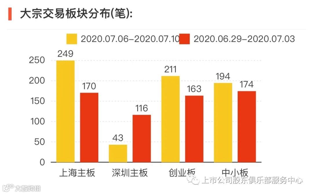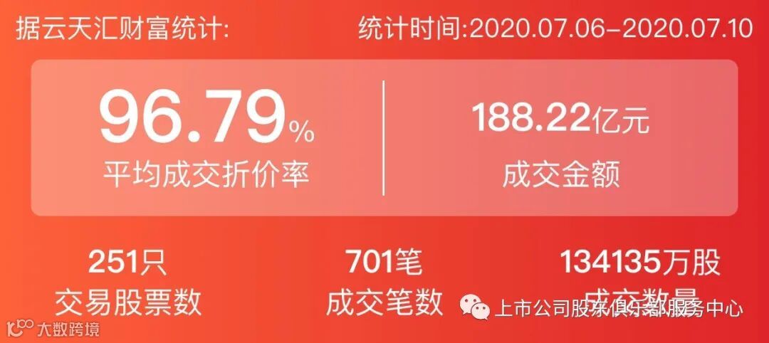 2020年7月6日至7月10日,大宗交易成交金额188.22亿元,交易股票数251只,成交笔数701笔,平均成交折价率为96.79%,成交数量134135万股。