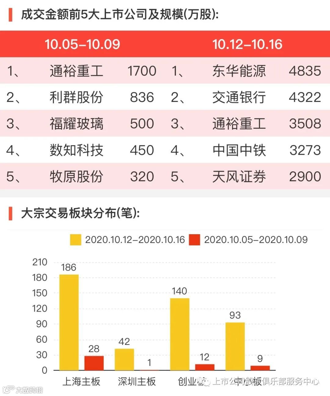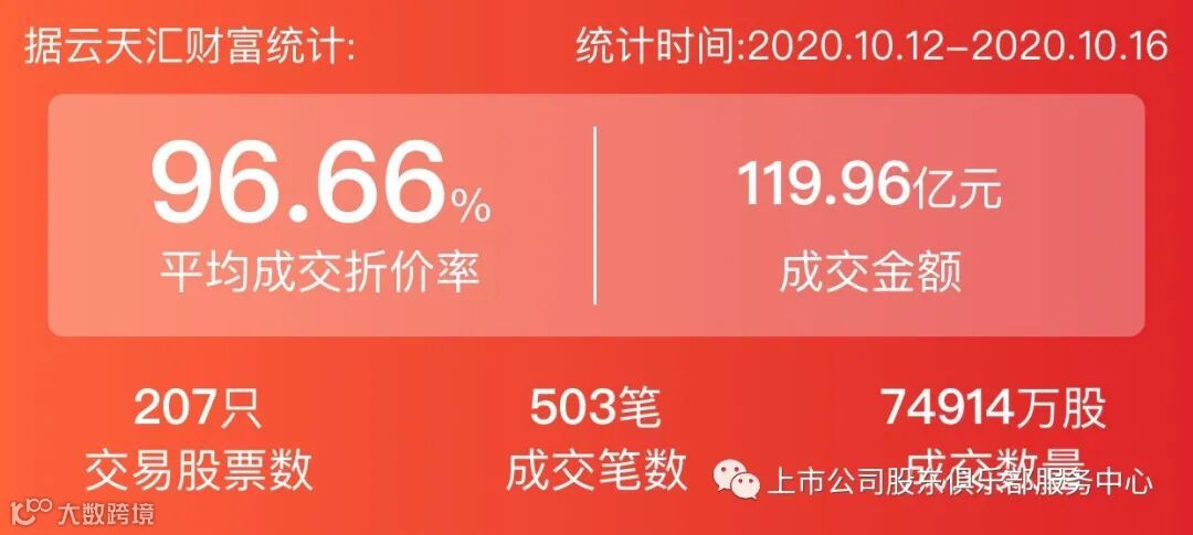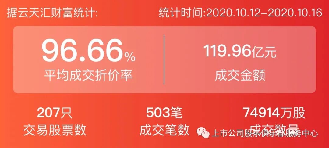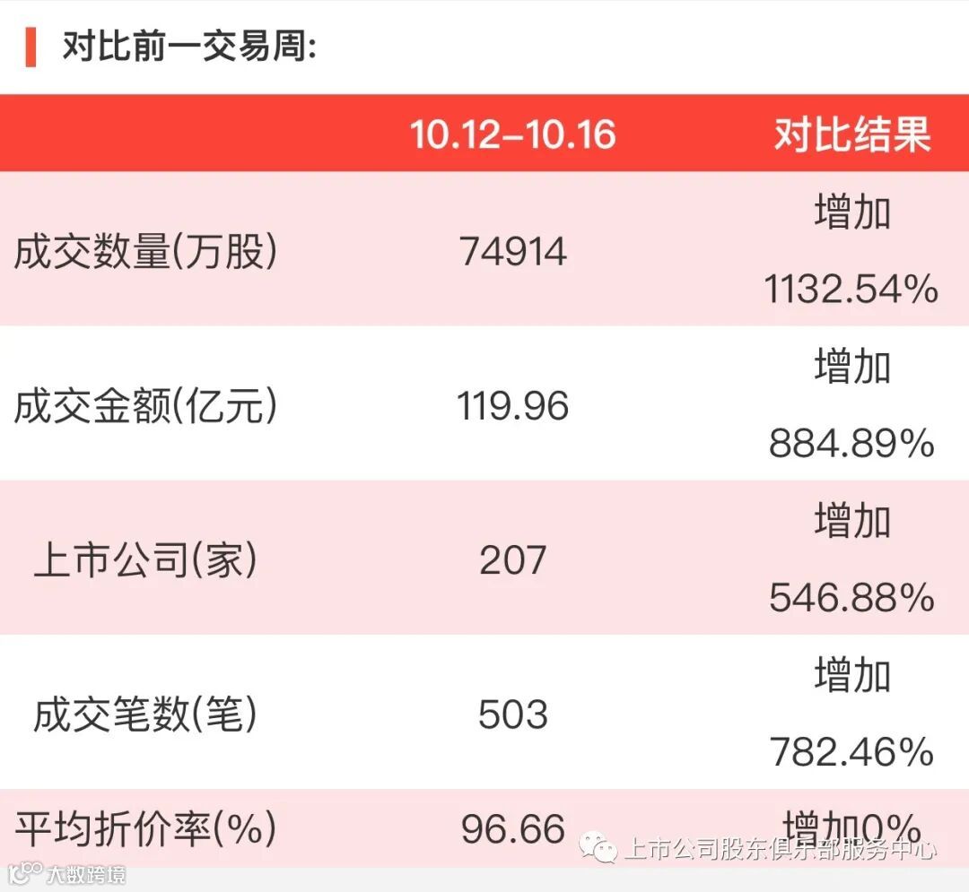 2020年10月12日至10月16日,大宗交易成交金额119.96亿元,交易股票数207只,成交笔数503笔,平均成交折价率为96.66%,成交数量74914万股。