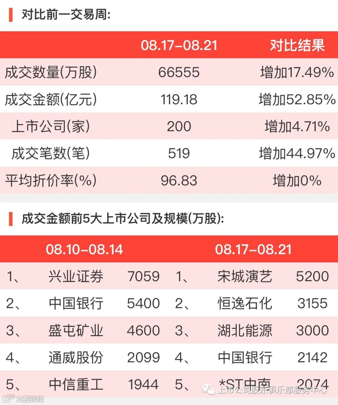 2020年8月17日至8月21日,大宗交易成交金额119.18亿元,交易股票数200只,成交笔数519笔,平均成交折价率为96.83%,成交数量66555万股。