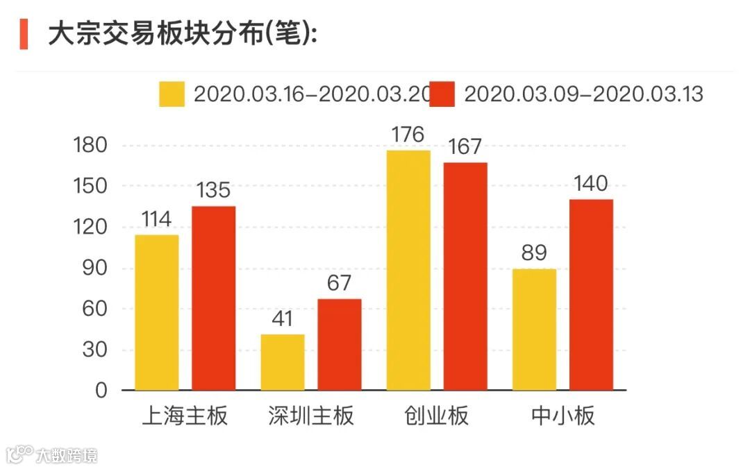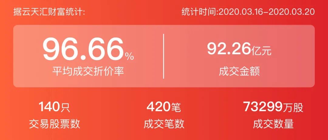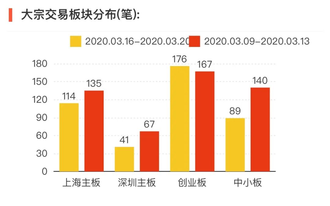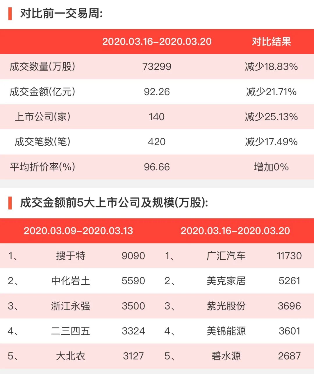 2020年3月16日至3月20日,大宗交易成交金额92.26亿元,交易股票数140只,成交笔数420笔,平均成交折价率为96.66%,成交数量73299万股。
