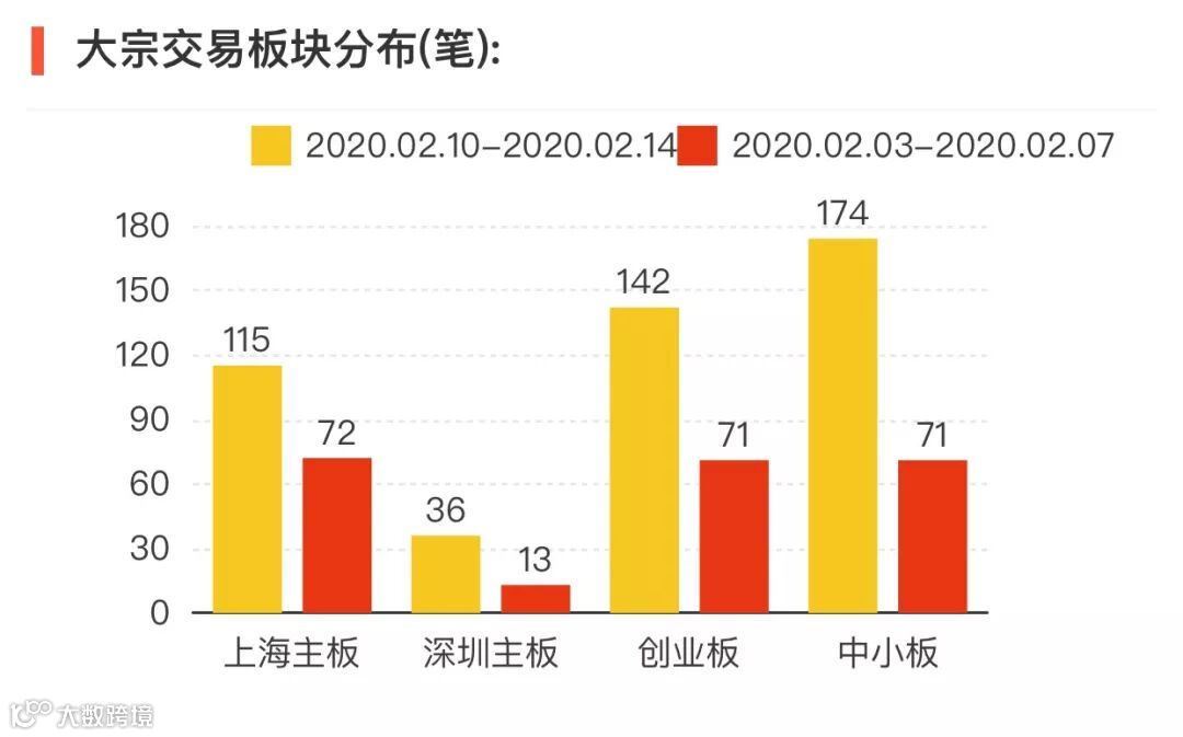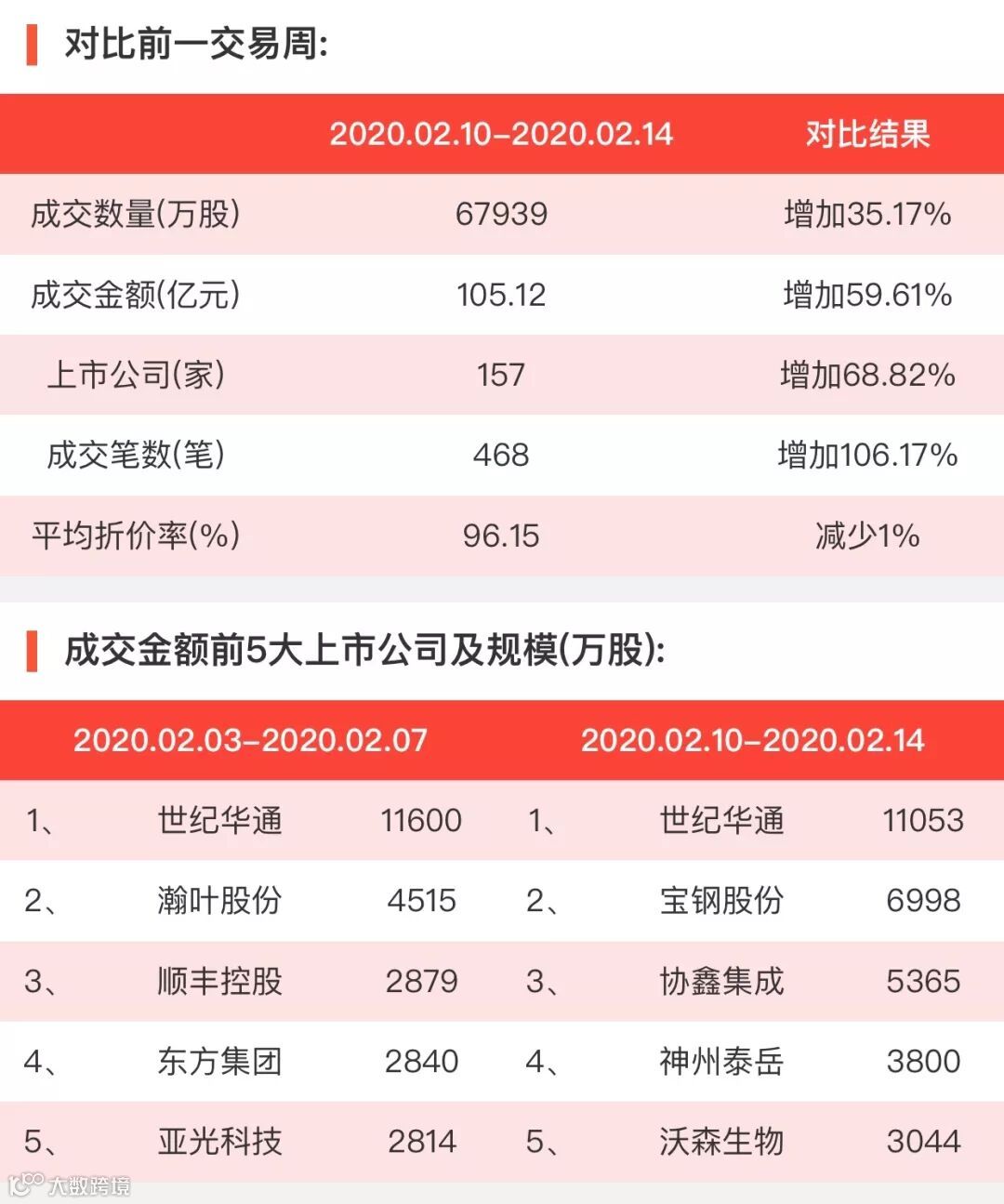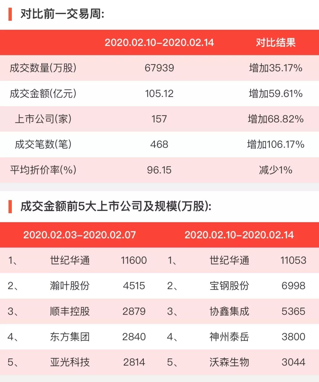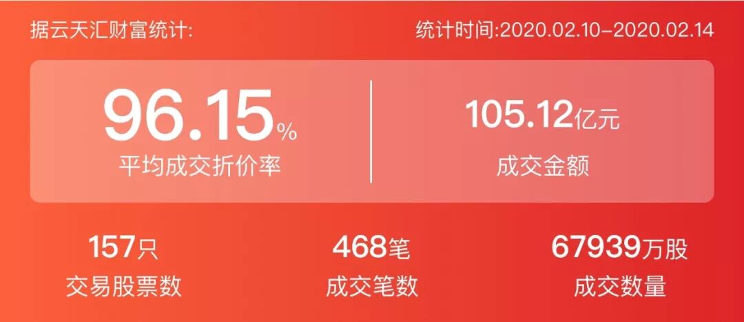 2020年2月10日至2月14日,大宗交易成交金额105.12亿元,交易股票数157只,成交笔数468笔,平均成交折价率为96.15%,成交数量67939万股。