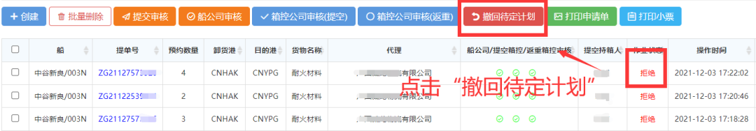 【拒绝】:计划被拒绝,“码头备注”一栏查看拒绝原因。