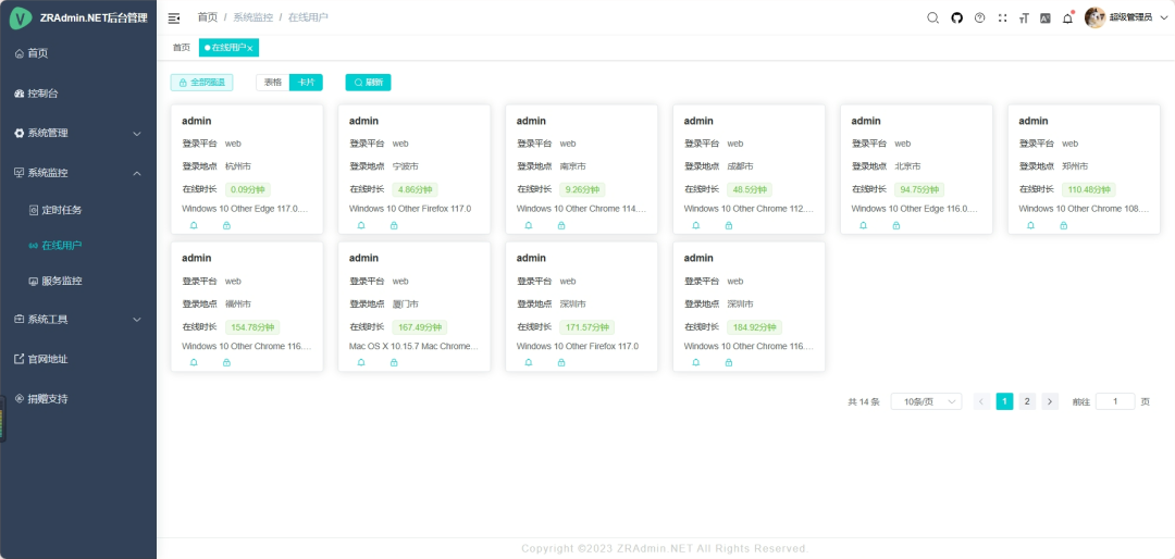 ZrAdminNetCore 是一款基于前后端分离架构、跨平台部署的通用权限管理后台系统,采用 RBAC(Role-Based Access Control) 权限模型设计,支持多租户、动态菜单、细粒度权限控制等功能。项目以 .NET Core 为后端技术栈,结合现代化前端框架构建,适用于企业级中后台管理系统快速开发。