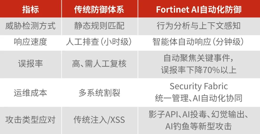 这些指标不仅展示了AI技术的效率提升,更体现了Fortinet在融合安全与AI自动化上的独特优势: