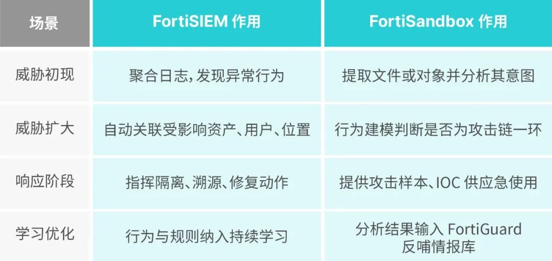 在多个部署案例中我们看到,FortiSIEM及 FortiSandbox与Fortinet其他安全组件是天然协同的: