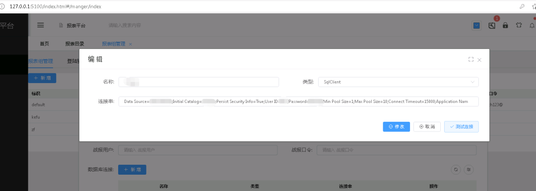 缺省已经有了一个default组和example组。第一次登录,选报表组管理做基本的配置报表存放路径和数据库链接。可以根据不同的应用建立不同的组。报表组可以添加协助管理人员,多个用户中间用英文逗号分割。