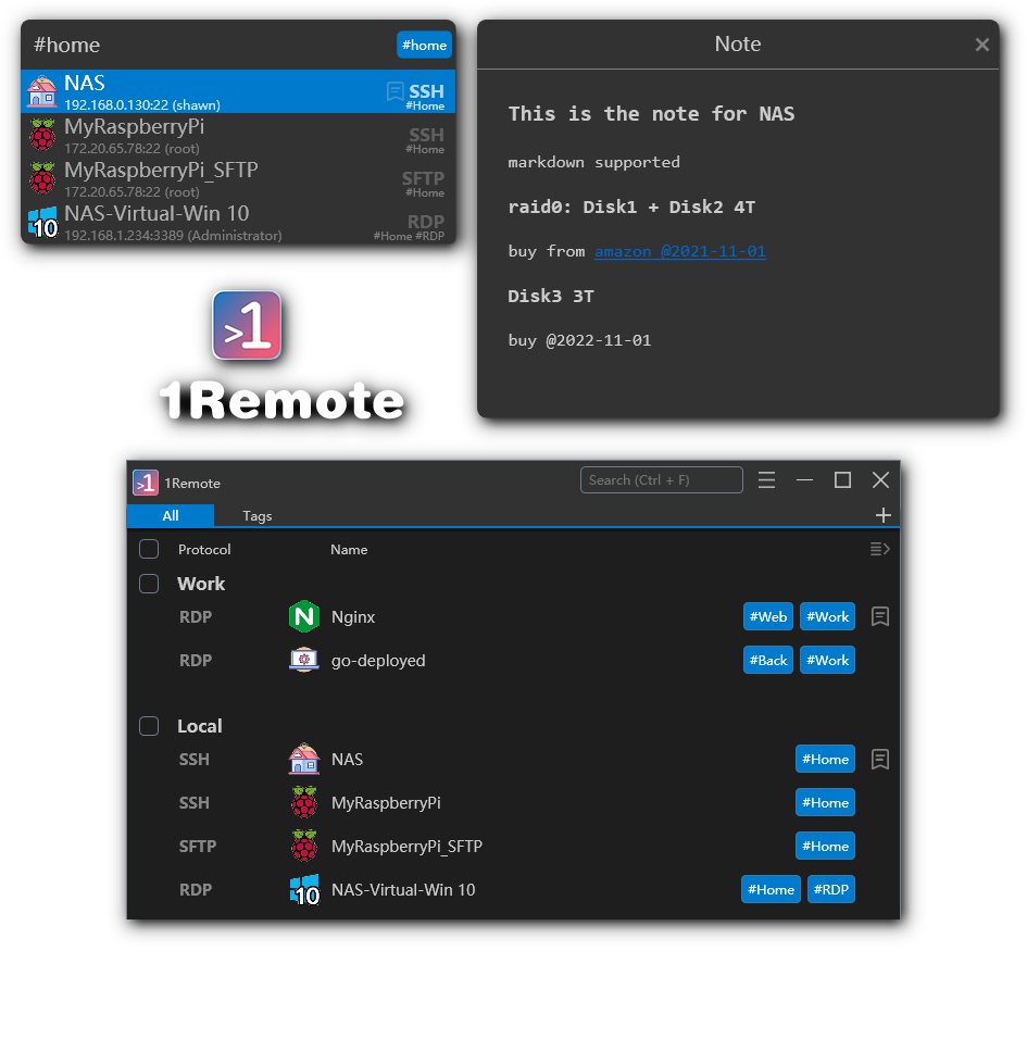 1Remote 是一个现代化的个人远程会话管理和启动器,适用于需要管理多种不同协议远程会话的用户。无论是系统管理员、开发人员还是IT支持人员,都可以通过1Remote在一个集中的地方管理他们的所有远程连接,提高工作效率和便利性。