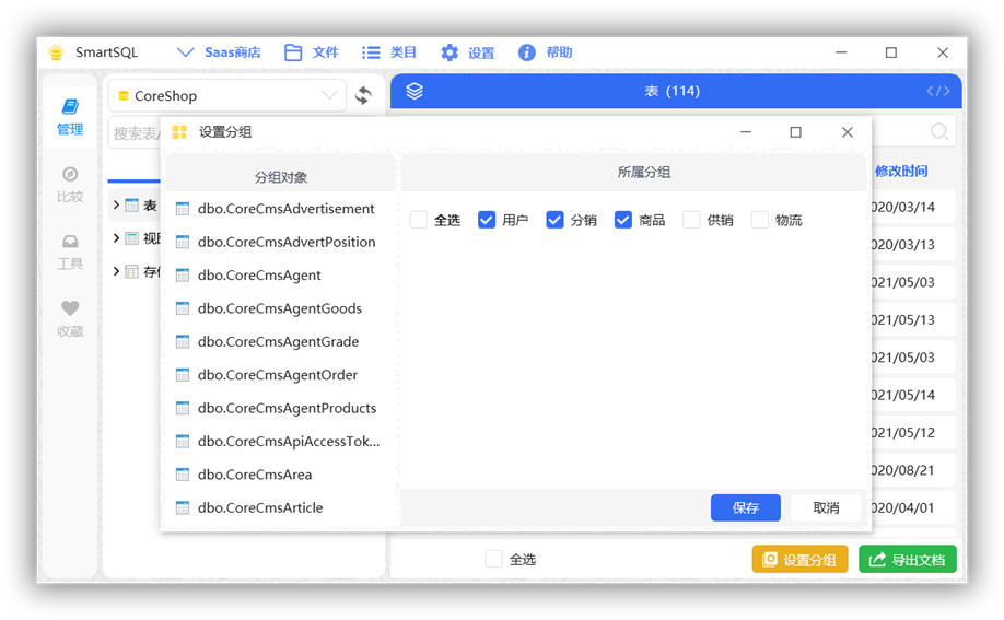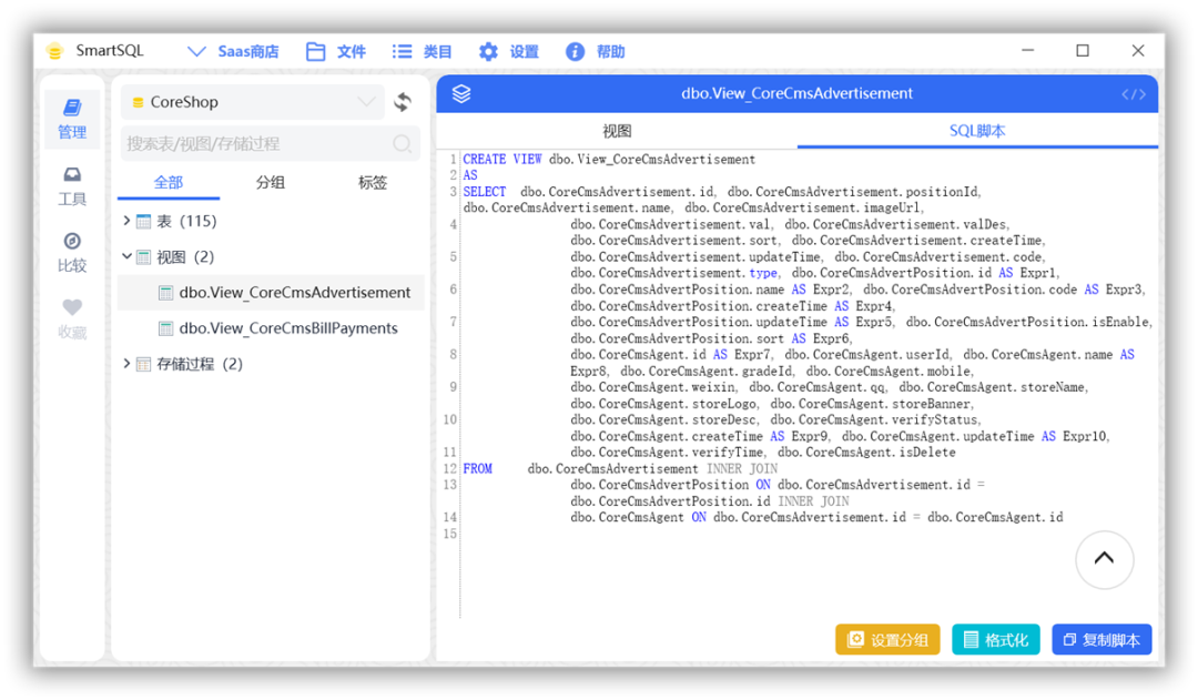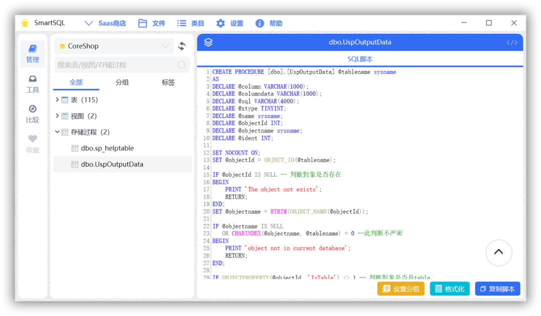 分组管理:允许用户对数据库中的表、视图、存储过程进行自定义分组,便于管理和查询。同时支持对分组进行排序和设置默认展开/不展开状态。 -