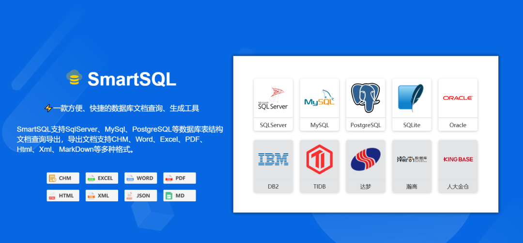 SmartSQL 是一款开源(Apache-2.0)、方便、快捷的数据库文档查询、导出工具!从最初仅支持SqlServer数据库、CHM文档格式开始,通过不断地探索开发、集思广益和不断改进,又陆续支持Word、Excel、PDF、Html、Xml、Json、MarkDown等文档格式的导出。同时又扩展支持包括SqlServer、MySql、PostgreSQL、SQLite等多种数据库的文档查询和导出功能。