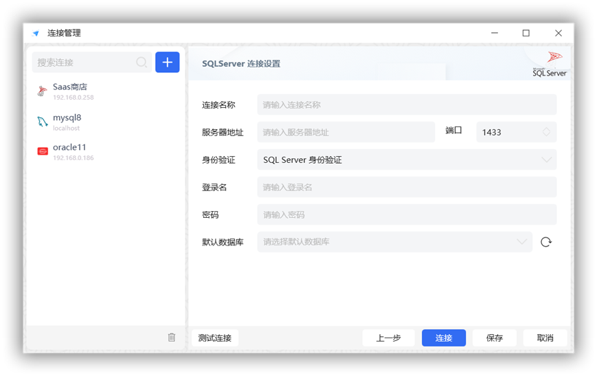 数据库连接管理:支持对多种数据库的连接配置,包括SQLServer、MySQL、Oracle、PostgreSQL、SQLite、达梦等,并允许用户对连接进行添加、修改和删除等操作。 -