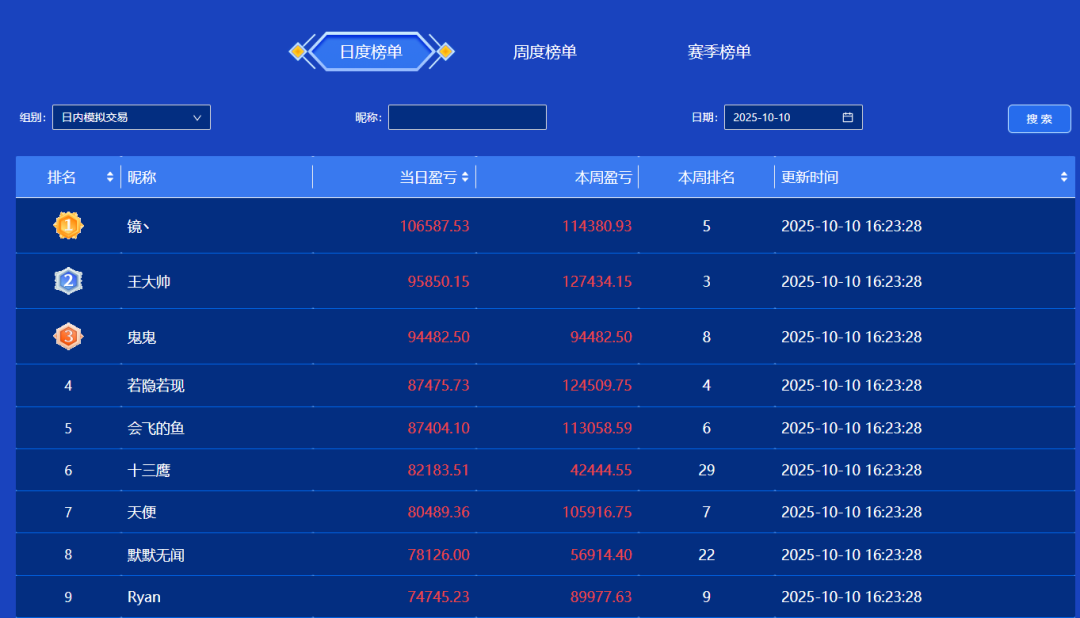 今天的日冠军是【镜】盈利了10.6万,恭喜恭喜,将获得日奖大礼包一份。