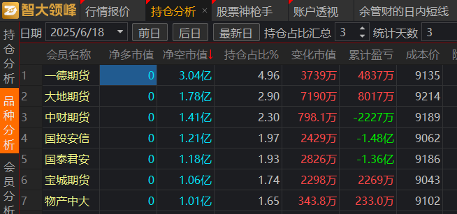 净空头前几名分别是一德期货,后面则是大地,中财,国投安信,国泰君安等。