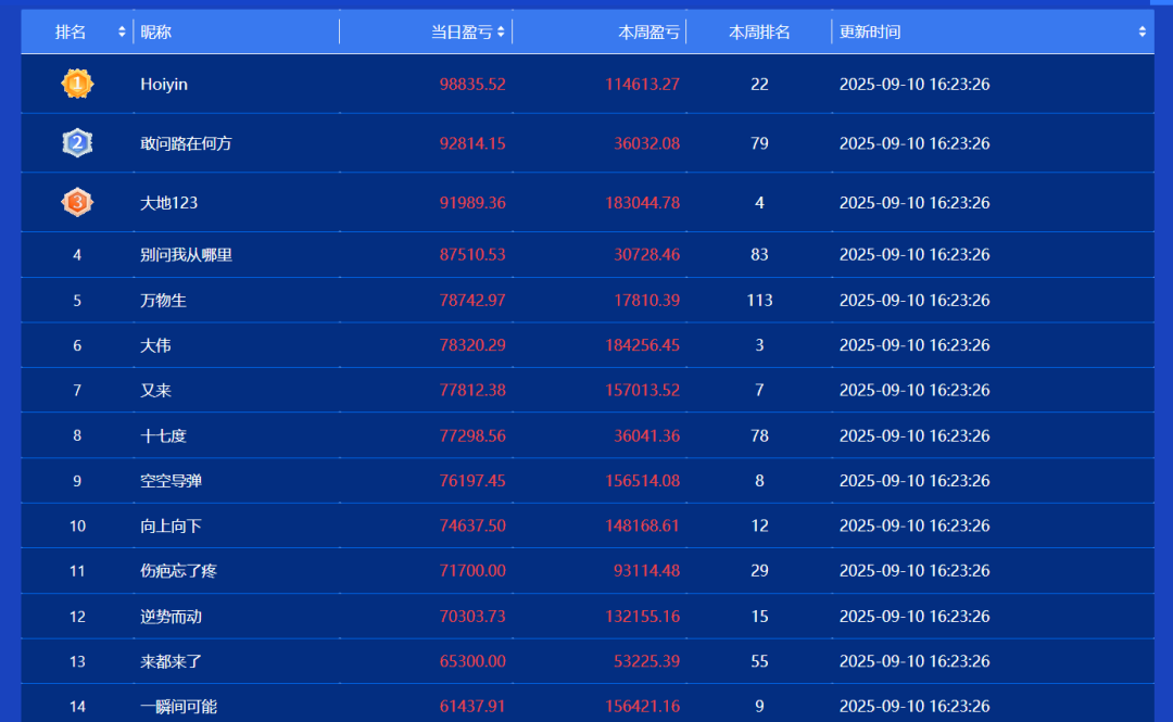 今日榜单出炉,冠军是【Hoiyin】盈利了9.88万。恭喜恭喜,请加余管财微信领奖。日奖礼包还是很丰厚的,是智大领峰定制水杯+蓝牙耳机+定制掼蛋+荣誉证书。