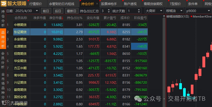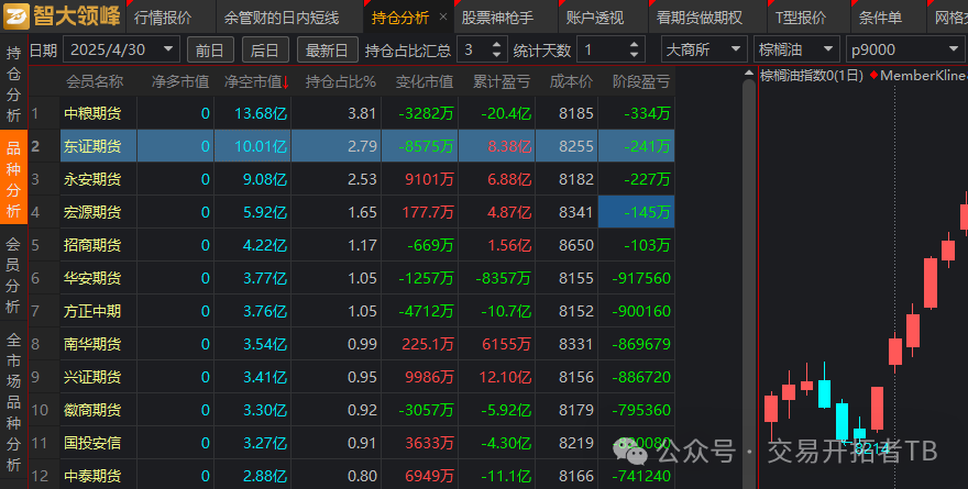 3、今天棕榈油也大跌,之前我写过印尼的生物柴油战略影响,让棕榈油价格会一定程度上跟随原油价格下跌。很多人都在等棕榈油的大顶,现在是有迹象的,因为高盛和摩根的多单持仓并没有明显增加,主力换月后中信的空单没有打进来,这两个国际投行的多单也没有大幅增加。反而是中粮这个国家队套保席位成为了最大的空头。