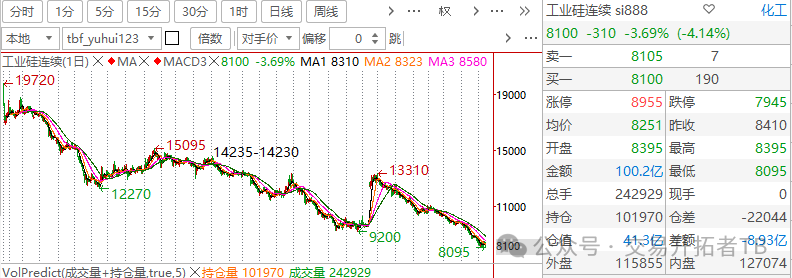 1、工业硅:刚上市时最高19720,今天收盘到8100,且还没有止跌现象。目前这个品种基本面是功大于求的局面。工业硅生产成本主要在电力端,原材料就是不值钱的砂子和一些催化剂。目前这个价格,如果用的时正常1块钱一度的商业电早就亏的裤衩都没有了。