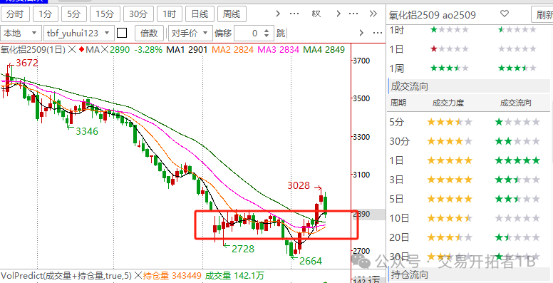 来分析一下技术面,氧化铝前面也是经历了一段拉升,但是今天大跌把趋势走坏了,现在来看,后面继续看震荡,回到这个中枢震荡。