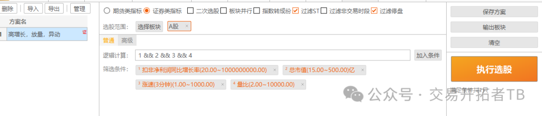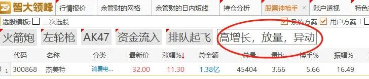 我用智大领峰设置选股条件为扣非净利润同比增长在20%以上,总市值为15-500亿之间,量比大于2,3分钟涨1%以上