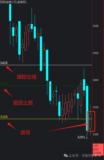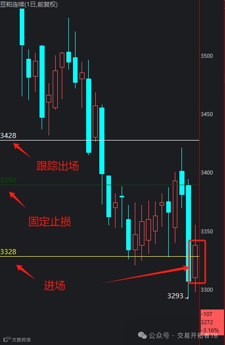 举例,我按上面理论方法在3328做空豆粕,设置固定止损在3390,跟踪出场在3428(100块价差)