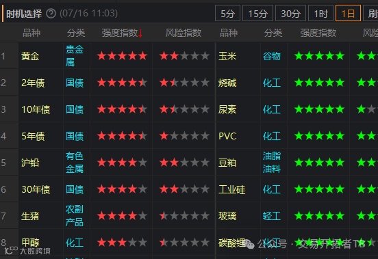 我不会写代码,这几天请同事把我的想法编程了一个指标。用它来看各品种的信号如下: