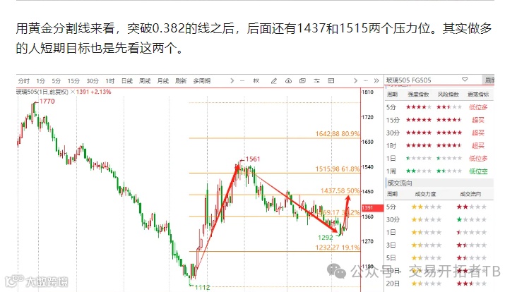 其中玻璃这个品种今天大跌3.86%,值得注意的是今天跌破支撑位置了。刚好是1个月之前写过玻璃,那时它是向上突破,我给出了1427和1515两个目标压力位置。结果是最高涨到了1466就掉头向下了。并且经过一个月的折腾,玻璃已经跌破一个关键支撑了。后面怎么看?