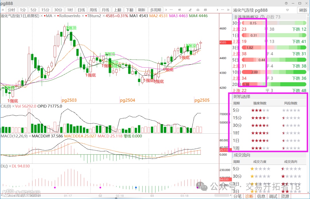 从品种诊断看, 能看出现在时机选择勉强进入到多周期共振的状态,从涨跌幅分布上来看, 液化气算是最近偏多头强势的品种,但其日线有没增仓,有没放量的, 为啥放进来看呢?