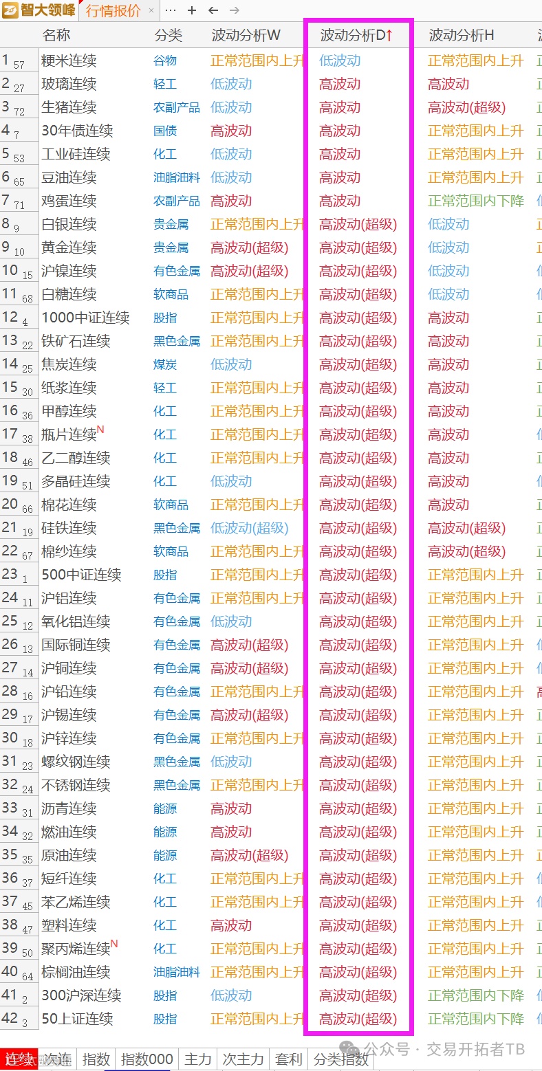 上面的截图是当前期货活跃的这个73个品种的日线波动情况的描述, 其中日线处于高波动状态的有57个, 处于极致高波动(超级)的品种有51个,换句话说,当前不是平时的期货市场状态, 是“非常时期”的期货市场。