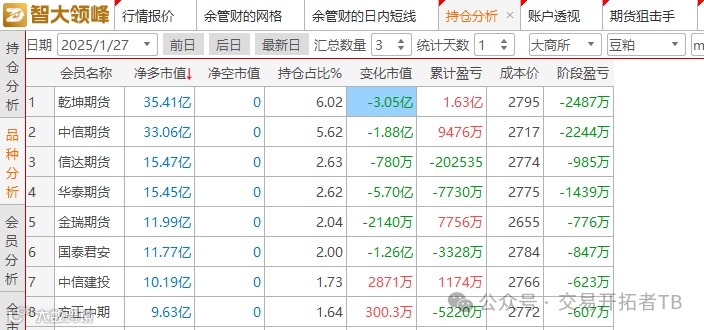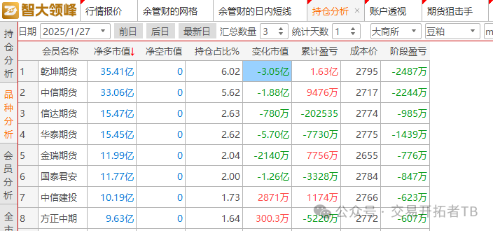 目前豆粕主力合约2505上最大的净多头是乾坤期货,其次是中信期货,后面分别是信达期货,华泰期货和金瑞期货。净空头老大是国投安信,老二中粮,老三摩根,老四一德,老五五矿,老六永安期货。从多空格局来看,豆粕期货长期都是“神仙打架”的格局。