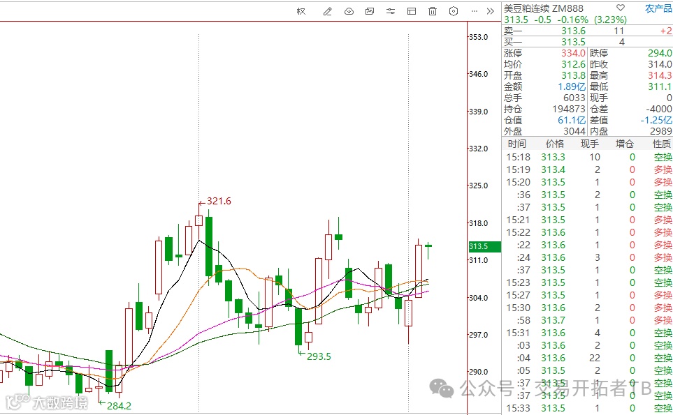 先来看看外盘,美国豆粕走势如下,昨天也是收了大阳线,今天日盘它波动比较小,因为美国佬都在睡觉,等我们晚上九点半之后,也就是美国佬开始上班的时候,美国豆粕就会开始剧烈波动了。如下图所示,要关注美国豆粕能不能突破321.6的压力。