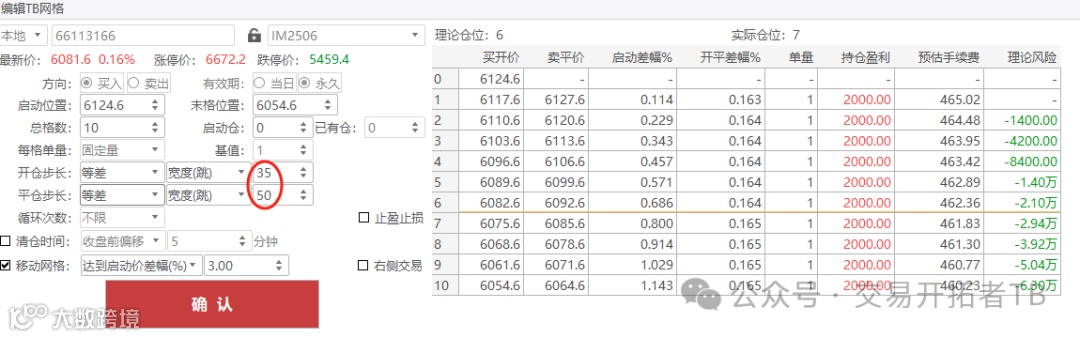 我在智大领峰上的设置是开仓步长35跳(价差7),平仓步长是50跳(价差10)。因为个人主观是看多股指的,所以开仓步长短一点能加到更多的仓,平仓步长大一点能赚到更多的钱。