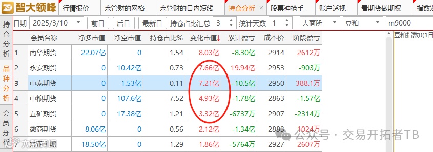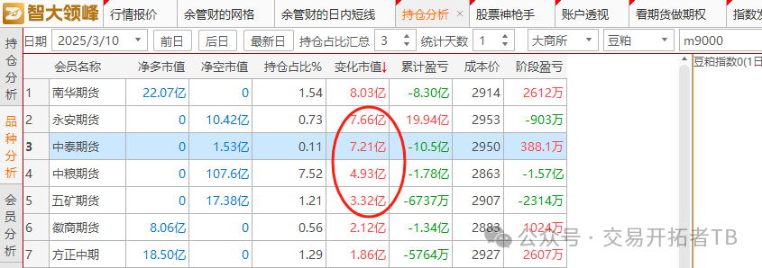 昨天大比例加仓做空豆粕的分别是永安,中泰,中粮和五矿期货。目前菜粕的主要空头是华泰,东证,国富,国泰君安,乾坤。明面上看不是一批人。
