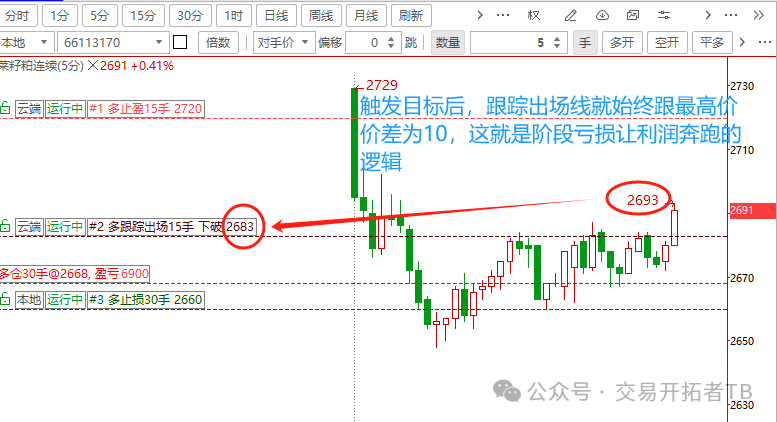 今天上午价格触发了2690后,我的跟踪出场设置启动,至此之后,我的出场价就会是阶段最高价向下10块钱的价差,比如下图,刚刚突破最高点到2693,我的跟中出场价格就跟踪上移到2683,这就是跟踪出场的魅力。